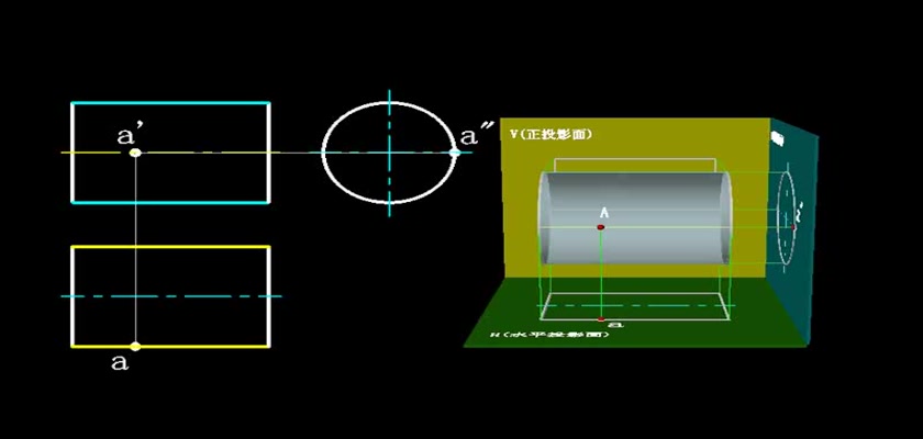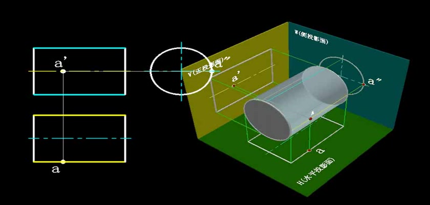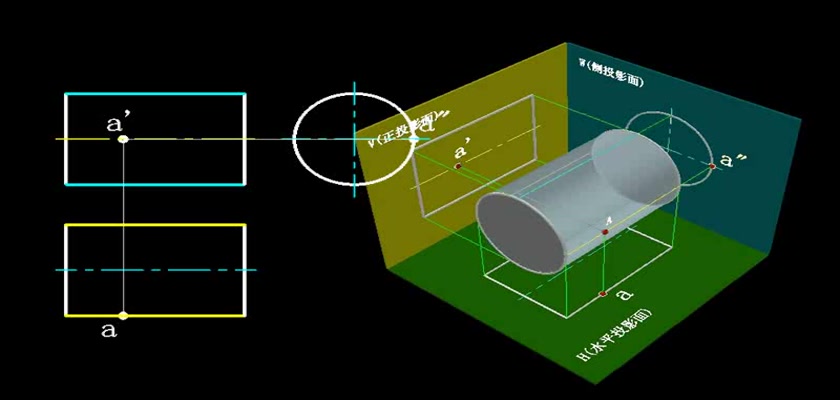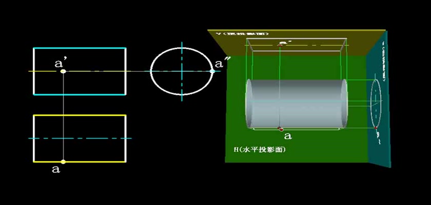 机械制图教学模型--动画--圆柱表面上取点轮廓线上的点直接求出