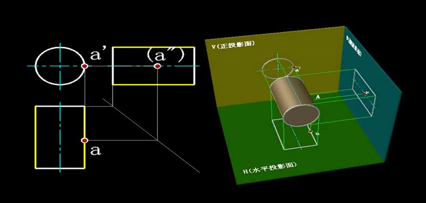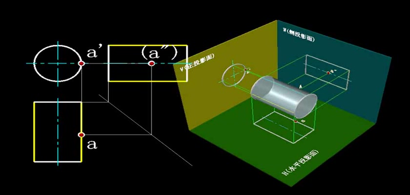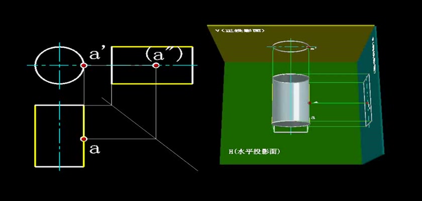 机械制图教学模型--动画--圆柱表面上取点轮廓线上的点直接求出