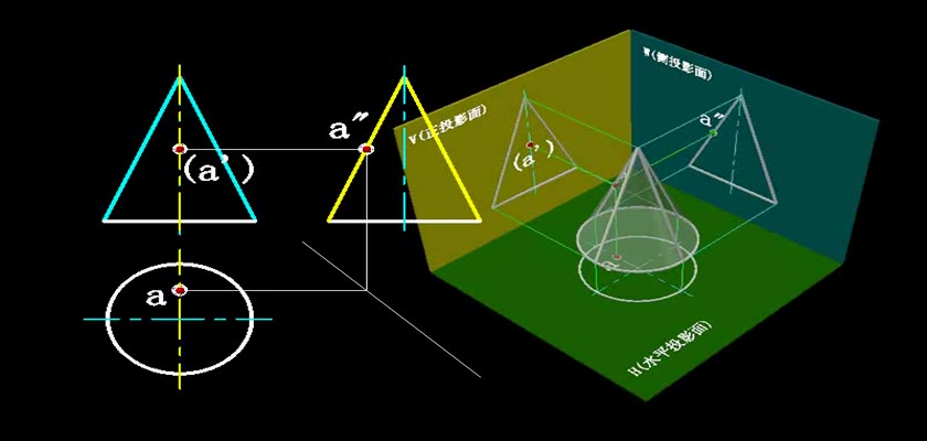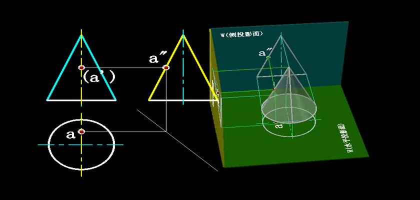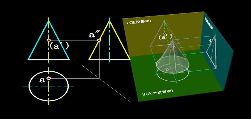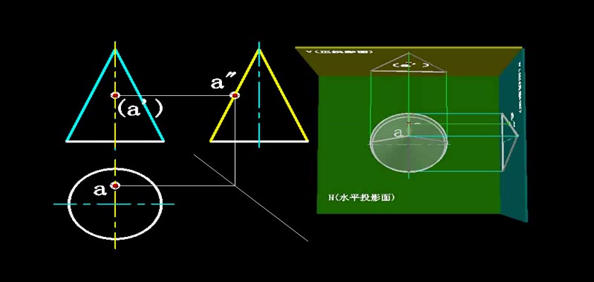 机械制图教学模型--动画--求圆锥表面上的点轮廓线上的点直接求出
