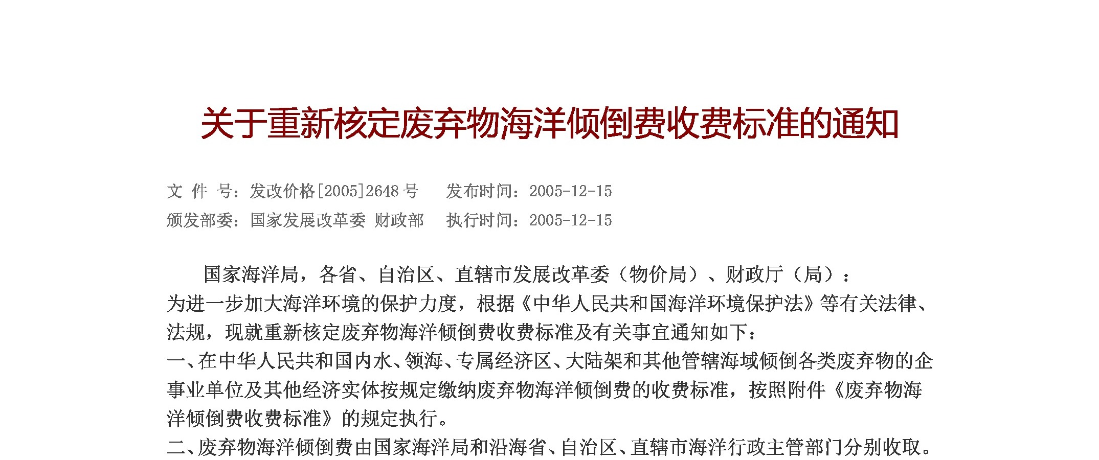 固体废物处理与处置-关于重新核定废弃物海洋倾倒费收费标准的通知